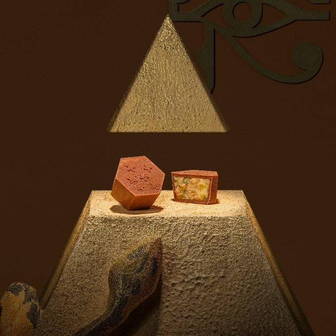 A flowing harmony of milk and white chocolate embracing a velvety almond gianduja core, filled with the golden sweetness of qamardin.